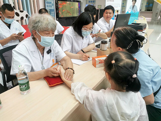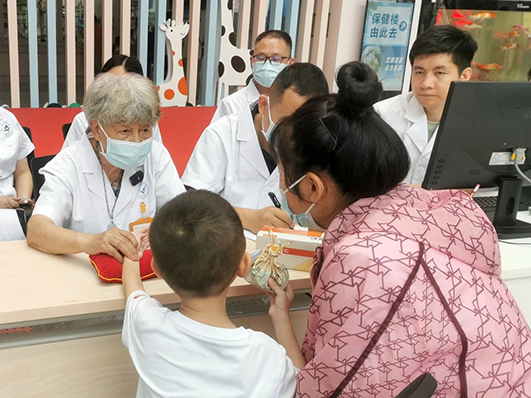 曾教授雖已90歲高齡,依然耳聰目明、精神矍鑠,她認(rèn)真聆聽(tīng)每一位患兒家長(zhǎng)對(duì)孩子病情的描述,詳細(xì)詢問(wèn)孩子的飲食、睡眠、運(yùn)動(dòng)等生活習(xí)慣并仔細(xì)把脈,依據(jù)孩子的具體情況制定治療方案。義診中,曾教授不忘帶教學(xué)生,以現(xiàn)場(chǎng)案例進(jìn)行講解,并將自己多年的診療經(jīng)驗(yàn)傾囊相授。