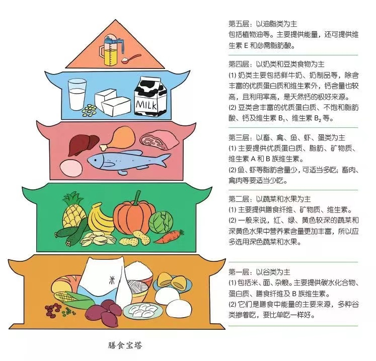 用以上膳食寶塔舉例,注重均衡營養(yǎng),食物多樣化,每天攝入12 種以上的食物,每周25 種以上。早餐應(yīng)吃3種以上食物,進食蔬菜時最好有一半深色蔬菜。
