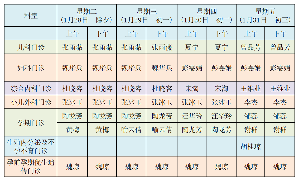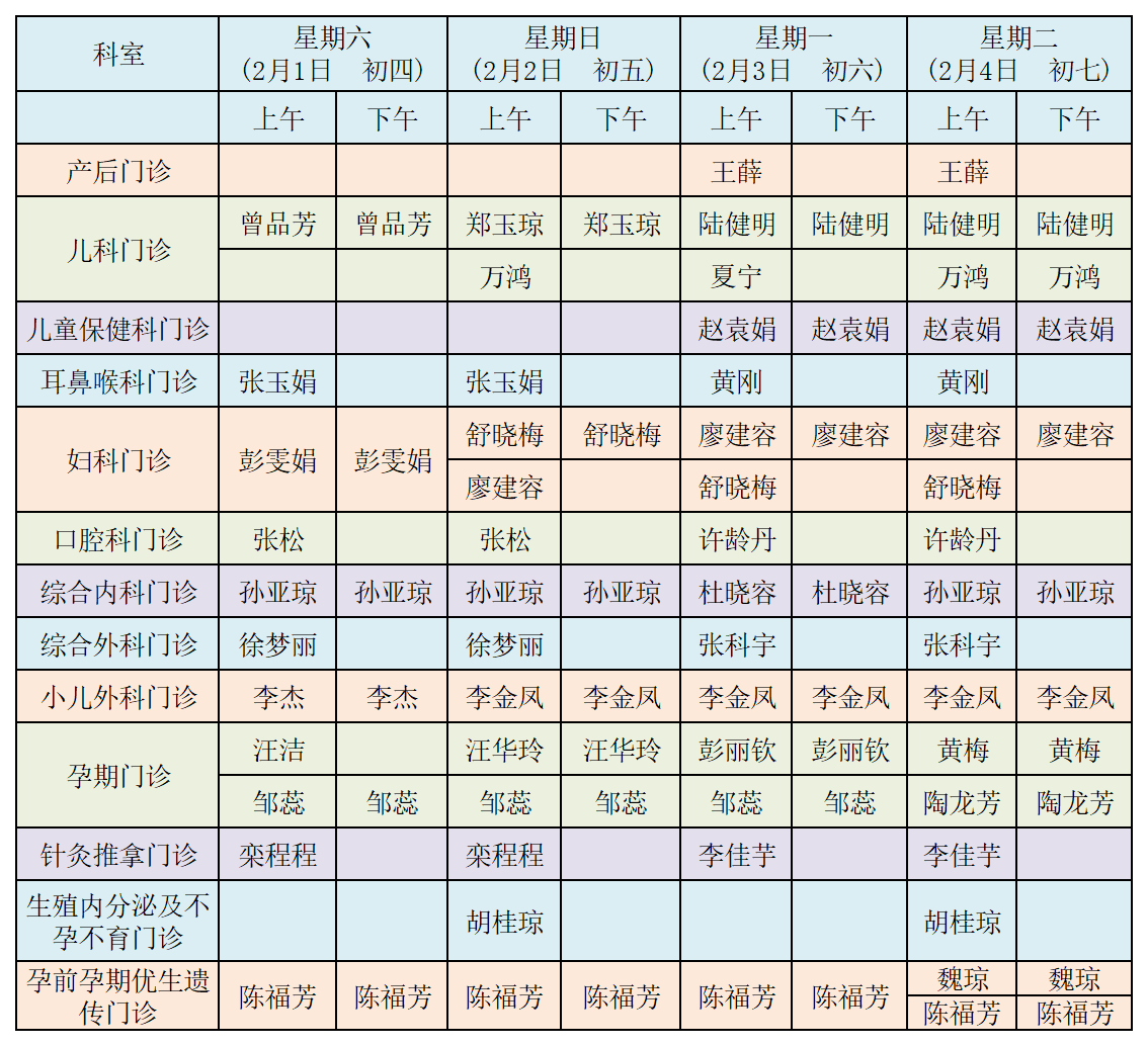 春節(jié)期間門診排班表(一)