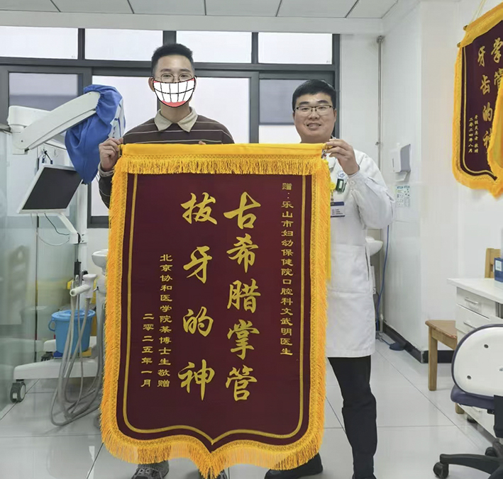 “原本以為一場(chǎng)完美的旅行要泡湯了,沒(méi)想到遇到‘古希臘掌管拔牙的神’!”近日,北京協(xié)和醫(yī)學(xué)院一名博士到樂(lè)山旅游,突發(fā)牙痛,無(wú)法忍受,到我院口腔科接受治療,術(shù)后特贈(zèng)錦旗致謝,贊美口腔科醫(yī)生文武明為“古希臘掌管拔牙的神”。