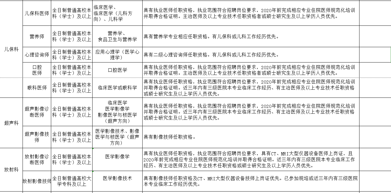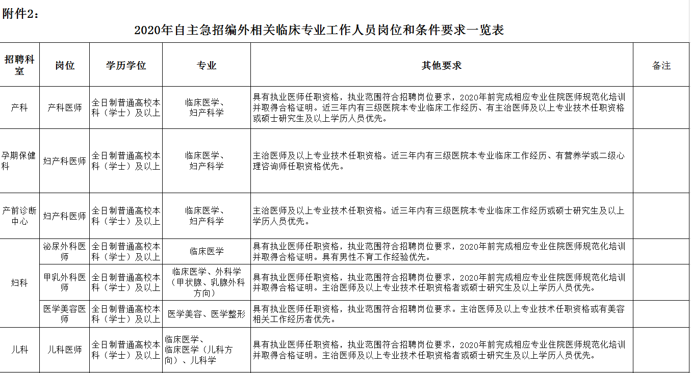 2、2020年自主急招編外相關(guān)臨床專業(yè)工作人員崗位和條件要求一覽表