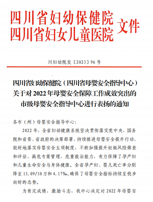 近日,四川省母嬰安全指導(dǎo)中心(四川省婦幼保健院)發(fā)文,對(duì)2022年度母嬰安全保障工作成效突出的單位進(jìn)行通報(bào)表?yè)P(yáng),樂(lè)山市母嬰安全指導(dǎo)中心(樂(lè)山市婦幼保健院)因在2022年母嬰安全保障工作中工作扎實(shí),成效明顯獲得表彰。