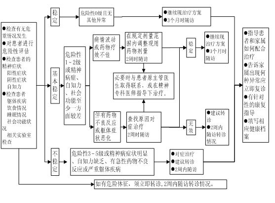 3.病情穩(wěn)定患者。若危險(xiǎn)性為0級,且精神癥狀基本消失,自知力基本恢復(fù),社會功能處于一般或良好,無嚴(yán)重藥物不良反應(yīng),軀體疾病穩(wěn)定,無其他異常,繼續(xù)執(zhí)行上級醫(yī)院制定的治療方案,3個月時隨訪。