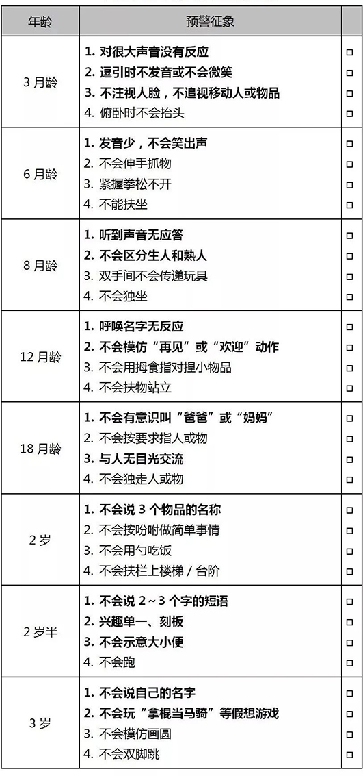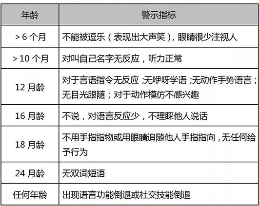 根據(jù)寶寶年齡,在表中查看對(duì)應(yīng)警示指標(biāo),如有相應(yīng)表現(xiàn),需考慮患有兒童孤獨(dú)癥。