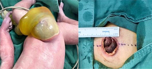 據了解,先天性臍膨出是一種嚴重的先天性腹壁發(fā)育缺陷,通常是由于胎兒在發(fā)育過程中腹壁未能正常閉合而導致的,發(fā)病率約為 1/3000~1/5000。表現(xiàn)為臍部有一凸出的囊狀物,內容物為腸管,如不及時進行手術,可能引發(fā)囊膜破裂后腸管脫出,造成壞死、感染,危及患兒生命。