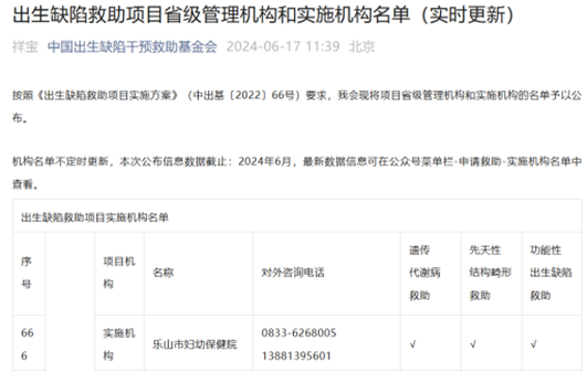項(xiàng)目實(shí)施機(jī)構(gòu)詳見中國出生缺陷干預(yù)救助基金會(huì)公眾號(hào),最新實(shí)施機(jī)構(gòu)名單: