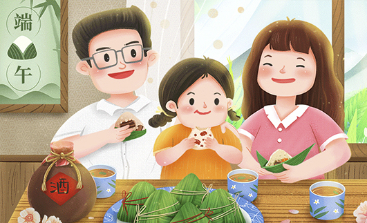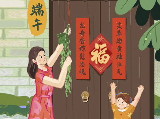 “粽子香,香廚房。艾葉香,香滿堂。桃枝插在大門上,出門一望麥兒黃。這兒端陽,那兒端陽,處處都端陽?!保▉碓矗憾宋缤{)